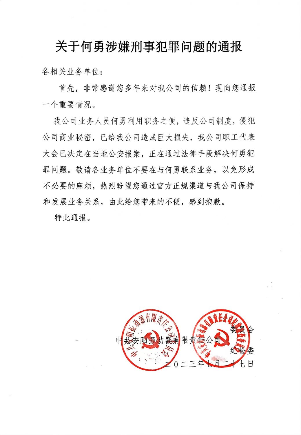 我公司業(yè)務(wù)人員何勇利用職務(wù)之便,違反公司制度,侵犯公司商業(yè)秘密,已給我公司造成巨大損失,我公司職工代表大會(huì)已決定在當(dāng)?shù)毓矆?bào)案,正在通過(guò)法律手段解決何勇犯罪問(wèn)題。敬請(qǐng)各業(yè)務(wù)單位不要在與何勇聯(lián)系業(yè)務(wù),以免形成不必要的麻煩,熱烈盼望您通過(guò)官方正規(guī)渠道與我公司保持和發(fā)展業(yè)務(wù)關(guān)系,由此給您帶來(lái)的不便,感到抱歉。